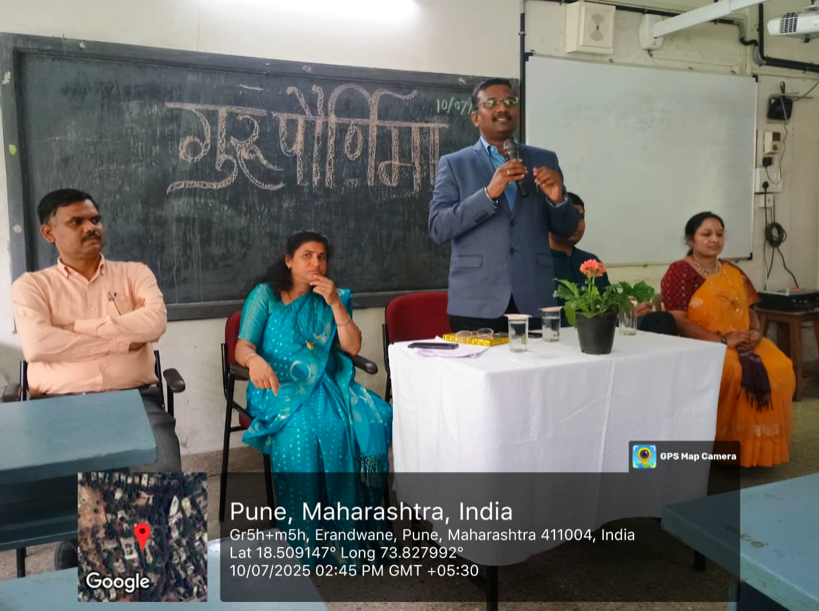 Guru Purnima was celebrated within the college premises on 10th July, 2025 in association with Bharatiya Shikshan Mandal (West Maharashtra Region). As part of celebration, a lecture was delivered by a renowned speaker Dr. Preetam Selmokar, who shared some thoughtful talk on the responsibilities of educators, importance of nurturing a respectful and collaborative learning environment and the spiritual essence of Guru Purnima.